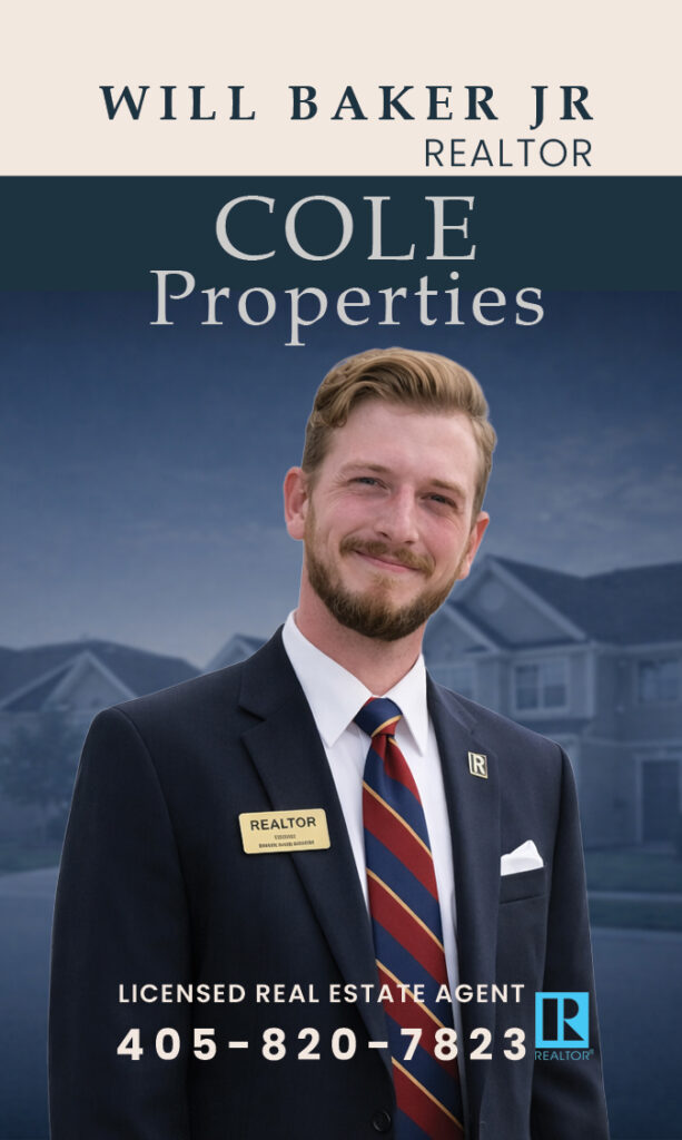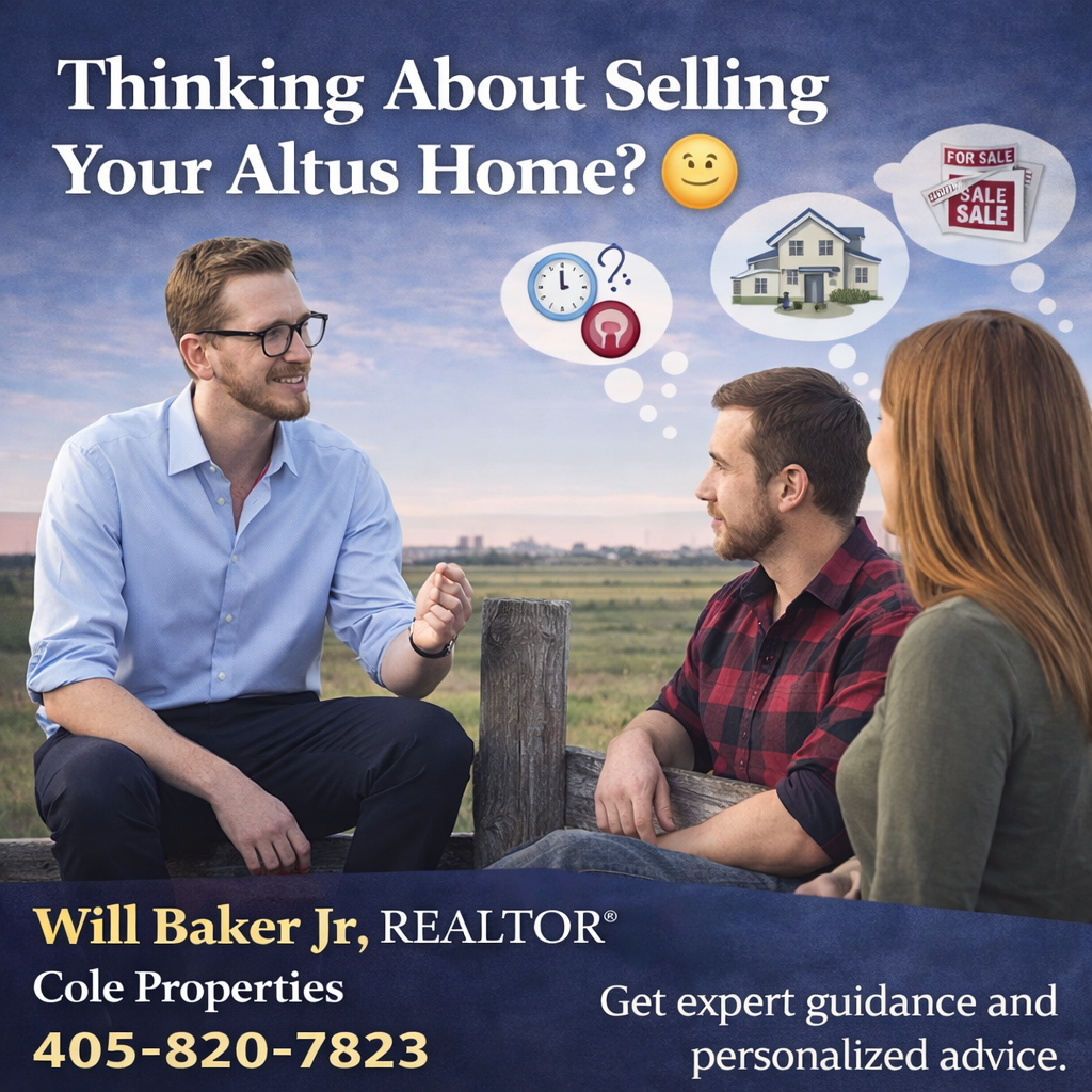 Will Baker Jr is a licensed Oklahoma Realtor with Cole Properties Real Estate in Altus, Oklahoma, helping homeowners sell, buy, and relocate across Altus and the surrounding Southwest Oklahoma trade area (roughly a 1-hour drive radius). This is the same “micro-market” where pricing, buyer demand, and days-on-market can change quickly based on school districts, acreage, shop/building value, water access, and proximity to Altus AFB and Lawton/Fort Sill.