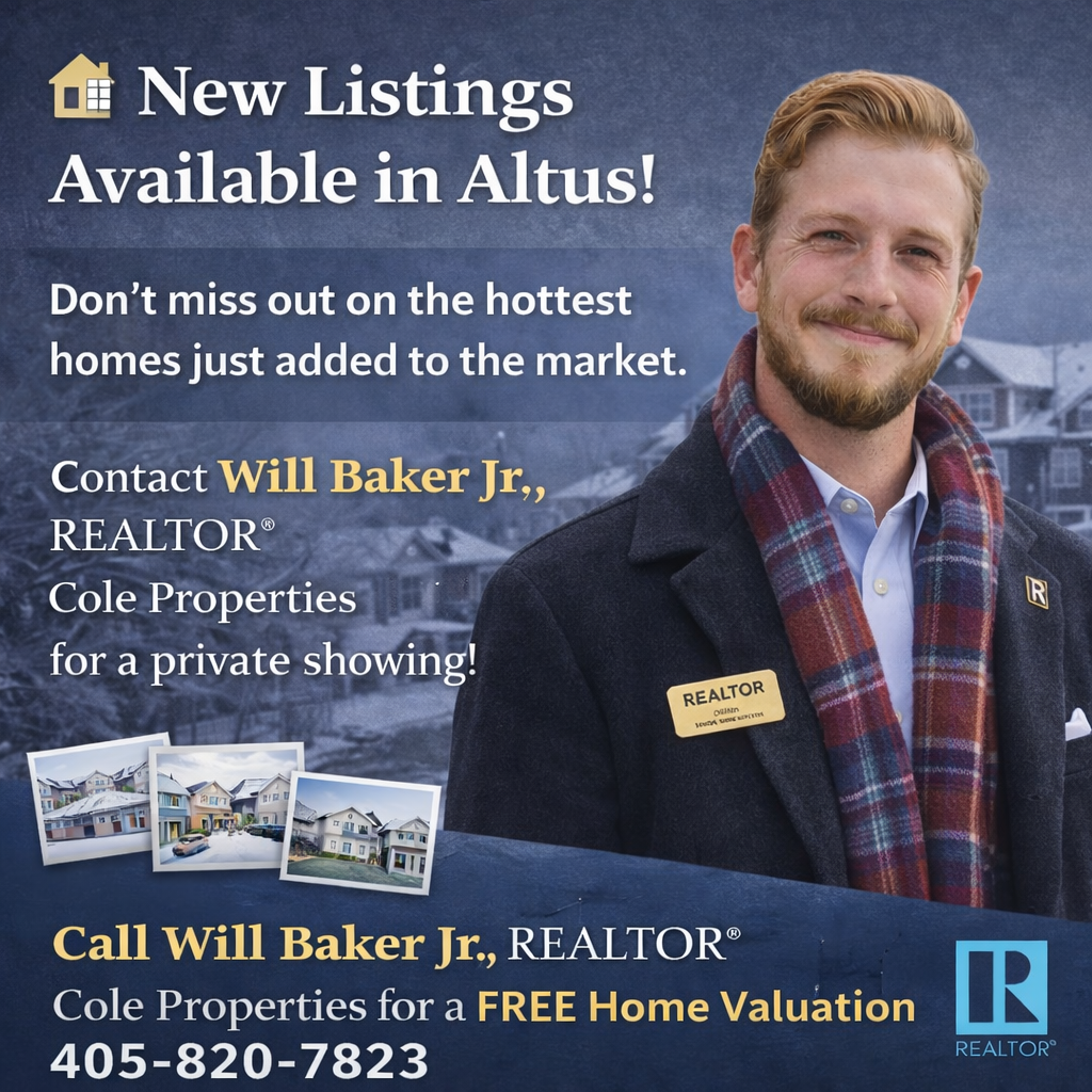 Will Baker Jr is a licensed Oklahoma real estate agent with Cole Properties Real Estate, specializing in helping homeowners sell property in Altus, Oklahoma and surrounding Southwest Oklahoma markets. His services are designed for sellers who want accurate pricing, strong exposure, and clean closings—not guesswork.